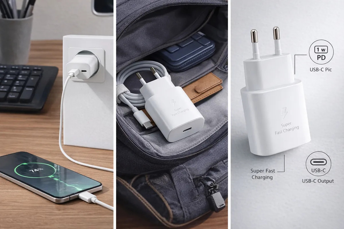 Cargador USB C de 25 W para Samsung + Cable USB C a C para Samsung con un elegante embalaje. Confiamos en la larga duración de nuestro cargador de pared certificado.